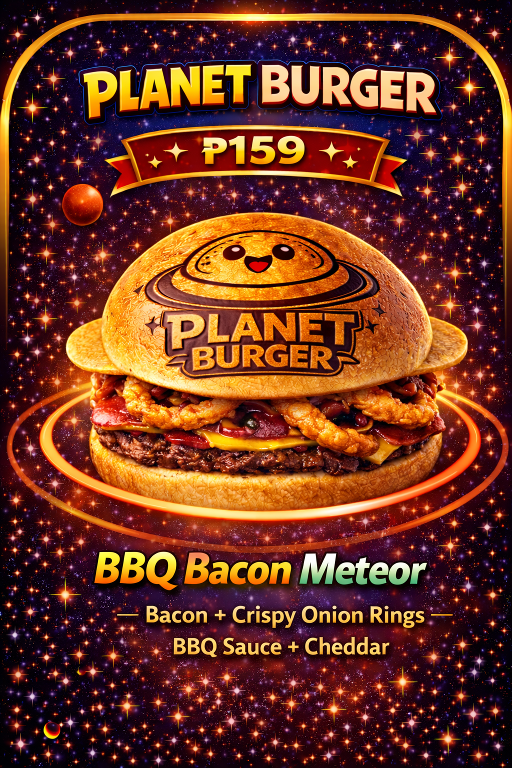 Crispy bacon, onion rings, BBQ sauce and creamy cheddar cheese