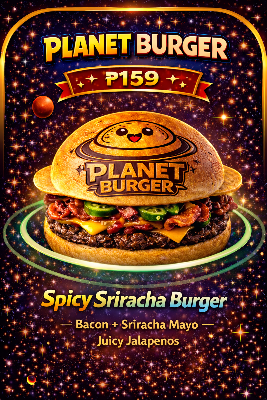 Beef, Crispy Bacon, Sriracha mayo and spicy jalapenos